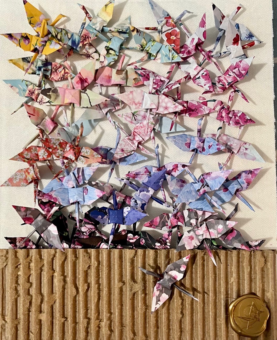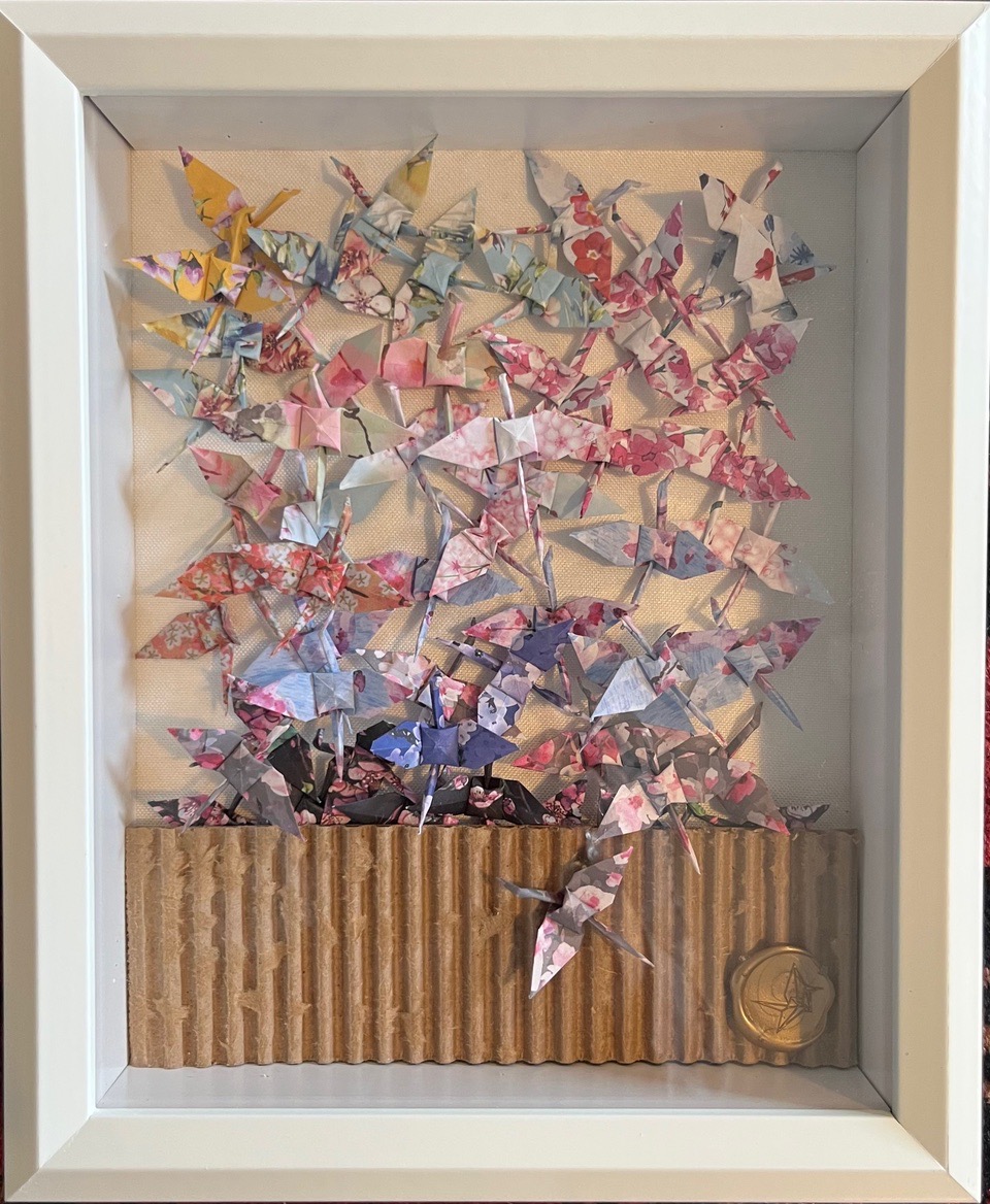 Let Joy Out of the Box” is 11”X 9” framed, in a shadow box. There are 54 origami cranes, folded from 2” squares of beautiful, pastel origami paper. 18 is a special number in Judaism, representing life and blessings. Three times 18 is three times the joy. The corrugated cardboard represents the box and the cranes, in their beautiful colors and patterns, are joy. Some of the cranes are elevated on small wires to give the piece some depth.