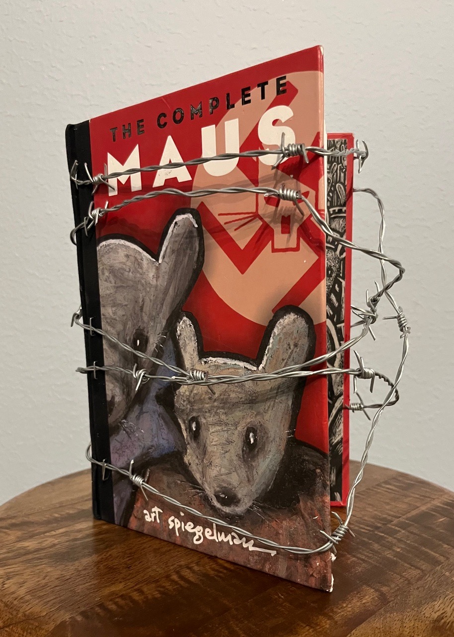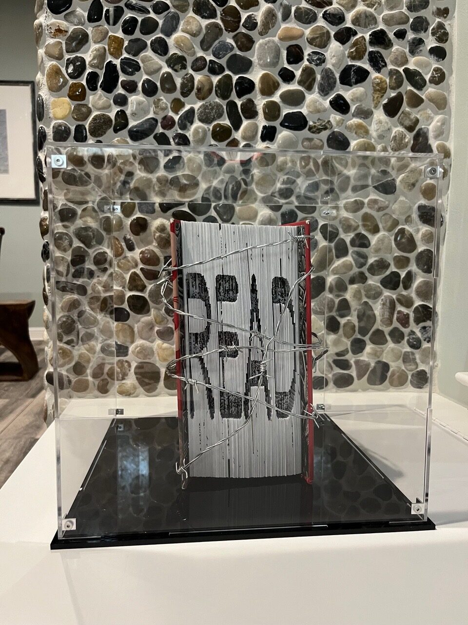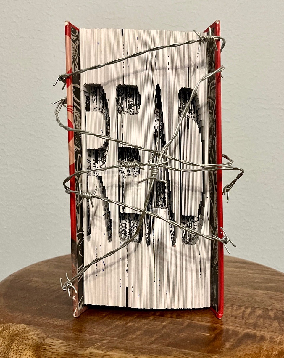 This piece is 11” square in the acrylic box. The book is a vintage copy of “Maus” by Art Spiegelman. Maus is a graphic novel describing the Holocaust and is a banned book in Tennessee. The book does have adult content and would be difficult for children and young teenagers to read without dialogue or context. The command to “Read” is cut and folded into the page edges of the book, one page at a time, the way one reads a book. The barbed wire mimics the fencing around the concentration camp and makes it dangerous to read the book. But the title is satirical. Not having the dialogue, not knowing and understanding history is dangerous. Not reading is more dangerous.