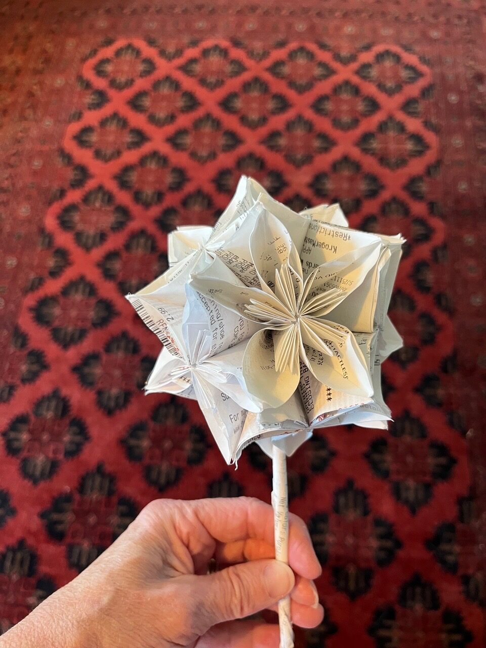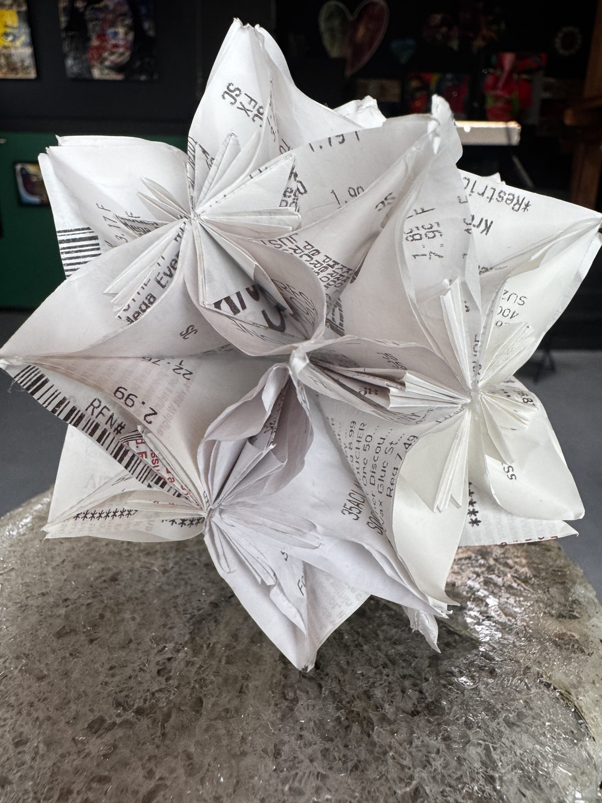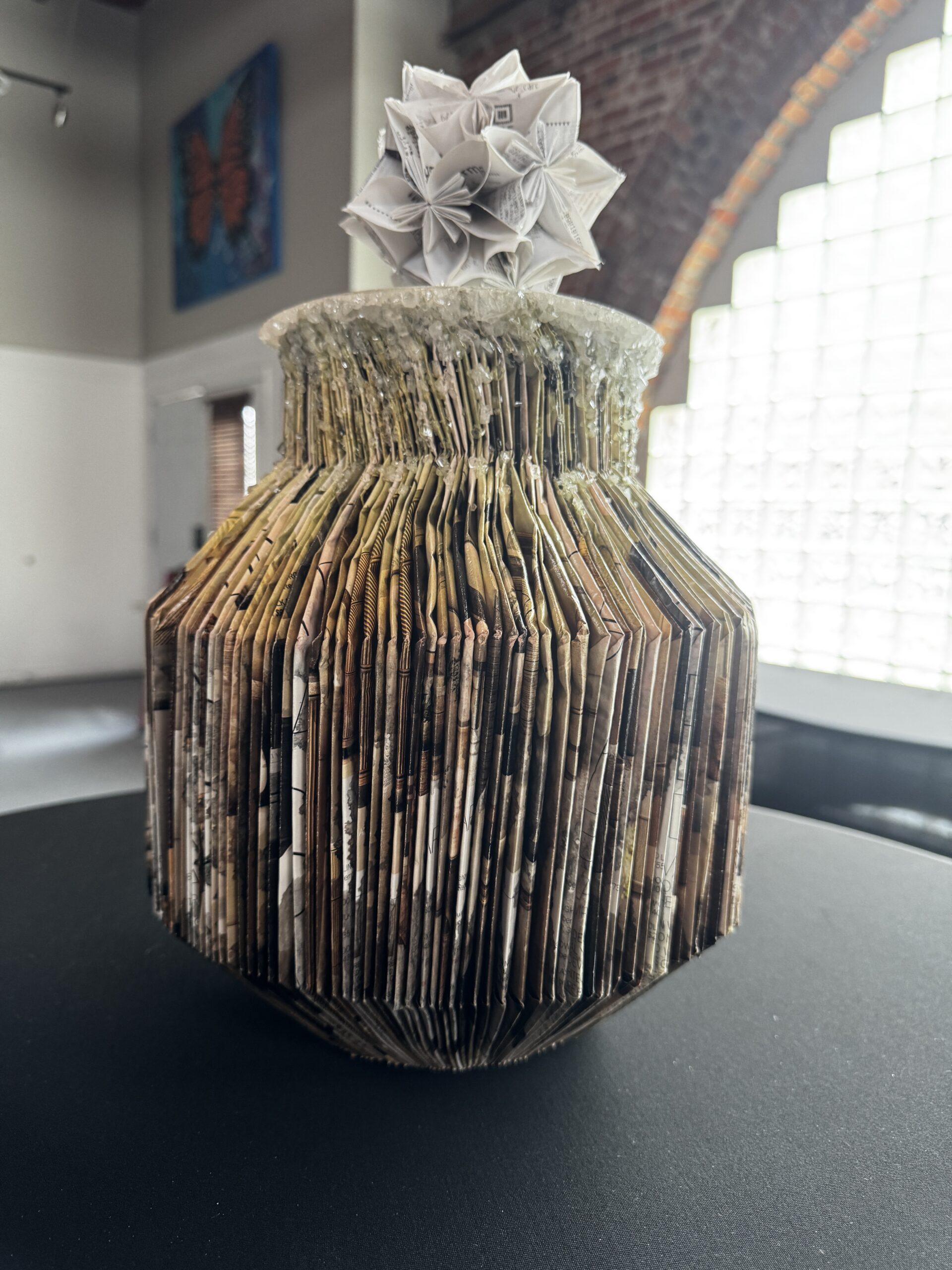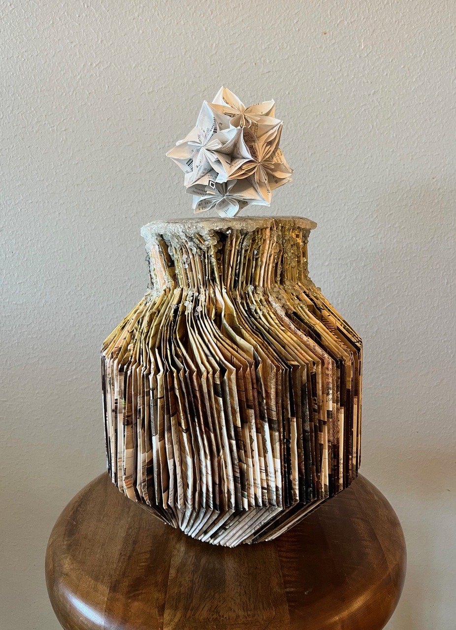 This “vase” is approximately 12” tall and 10” in diameter with a 6” origami kusudama ball, representing a flower, inserted in the top.