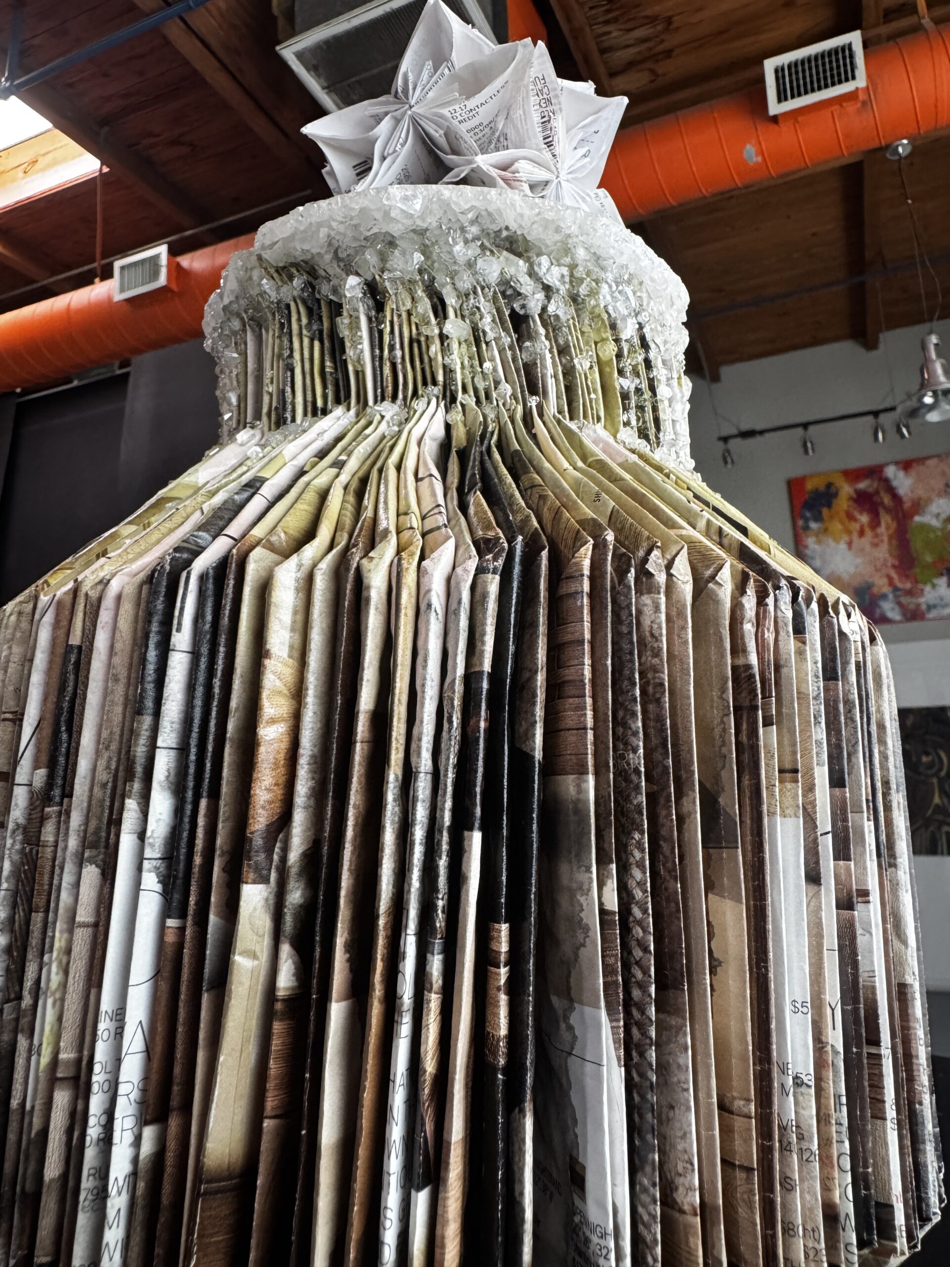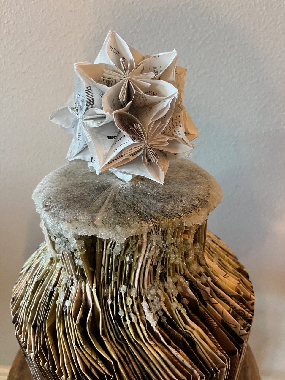 The piece is named “Valuable” because, superficially, it is not. The piece asks us to question what is valuable and what makes a thing valuable. The vase itself is folded from a discarded Restoration Hardware catalogue. (Restoration Hardware markets high end, expensive household products.) The flower is crafted from paper shopping receipts. The vase has been crystallized using Borax (a non-toxic laundry detergent). The crystals have been sealed with a polyurethane spray. The vase was soaked in a super-saturated solution of Borax for about 24 hours, twice, and then allowed to dry for several weeks.